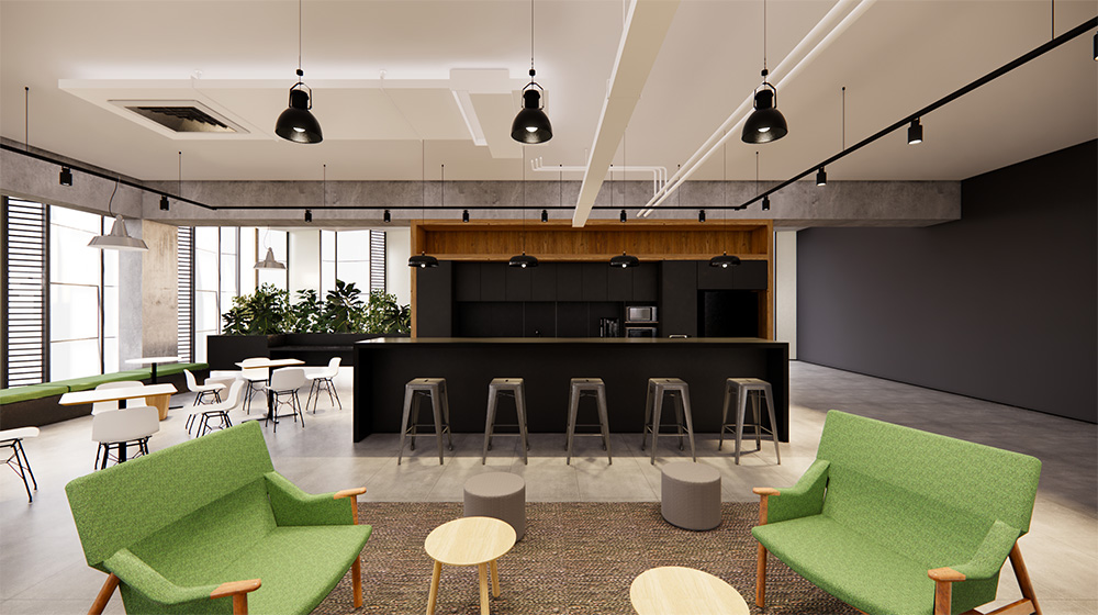 員工可以在這個(gè)區(qū)域吃午餐或者吃零食,這是一個(gè)可以讓員工腦暴新主意、探討最新項(xiàng)目的理想?yún)^(qū)域。