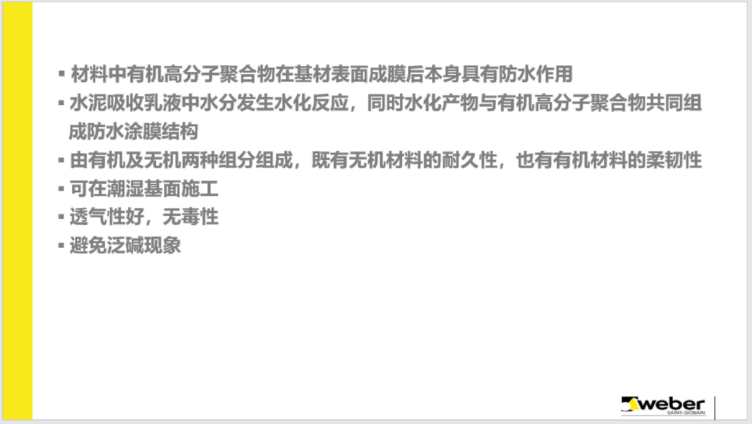 Weber high-soft waterproof coating is a two-component polymer modified cement-based waterproof coating. It is easy to construct. It can be used by mixing pre-packaged powder with prepared flexible polymer emulsion. Brush on a variety of different substrates. The product has excellent water resistance, corrosion resistance and strong weather resistance and impact resistance, which can effectively protect various buildings and structural concrete.