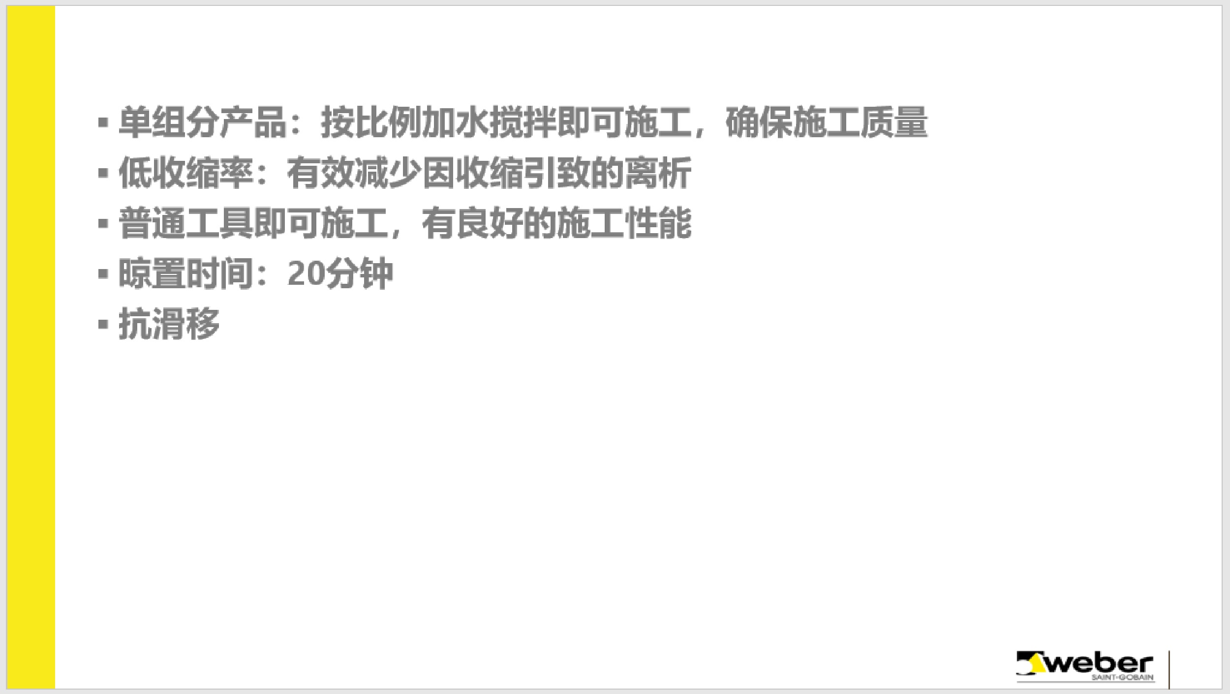 Weber High Performance Adhesive 313 is a one component water resistant tile adhesive that can be used with water and agitation. The product has high bond strength, good anti-sliding property and excellent construction performance, and is suitable for indoor and outdoor paste of various tiles. Suitable substrates include concrete walls, cement plastering surfaces, plasterboard, brick walls, and aerated concrete (ALC) blocks.