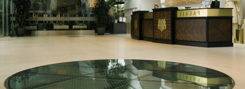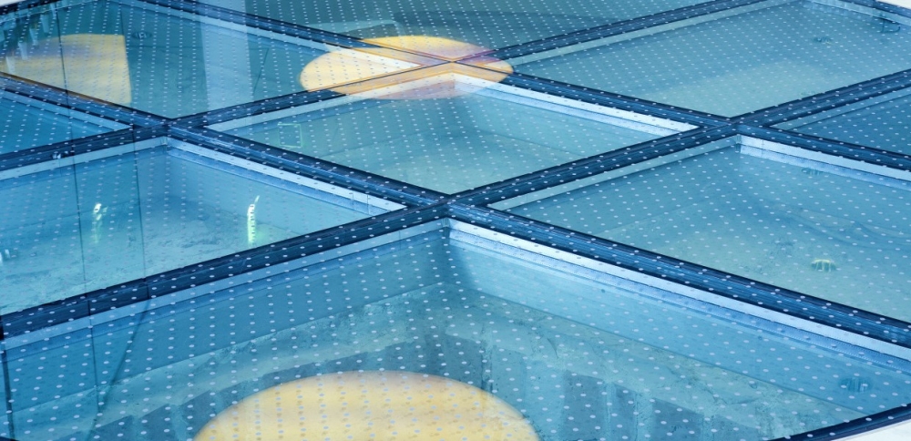 Vetrotech recommended the use of Lite-Floor, a walkable fire-resistant glass solution, which resists fire for up to 30 minutes. This eye-catcher made of glass features a special screen printing on its surface, which acts both as a design element and a protective anti-slip layer.