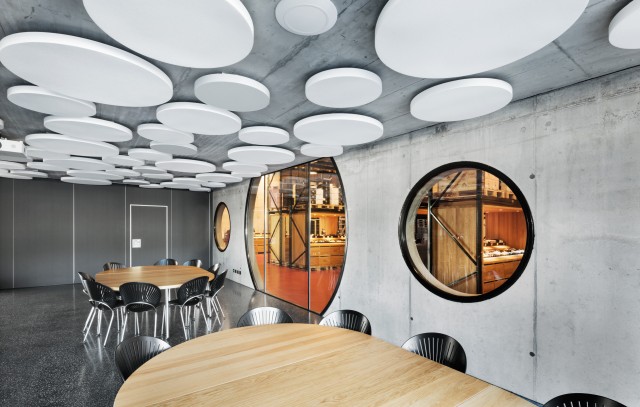 The round shaped partition walls connecting production and meeting rooms, in particular, were a great challenge for glazed fire-resistance.