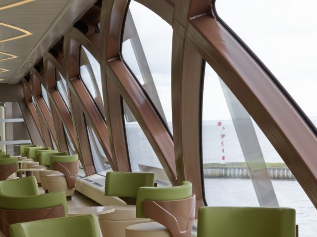 Vetrotech supplied insulating glass as double-glazed units with a low-E coating. Some were processed with a special screen-print in order to protect the glued joint from UV-rays. Additionally, Vetrotech provided heated glass panes (Thermovit) for the wheelhouse – done to prevent the glass from freezing over and misting. In order to protect the people and infrastructure in the event of fire, Contraflam fire-resistant glass was installed in various applications.