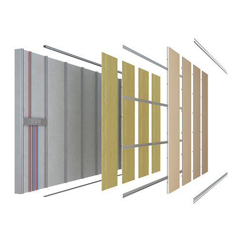 BUS背掛式隔墻也包含了獨立設(shè)計的鋁合金背掛龍骨能夠直接適用于平整墻面完成貼面墻裝配,或者直接配合傳統(tǒng)龍骨建立保溫貼面墻或背掛式隔斷墻。