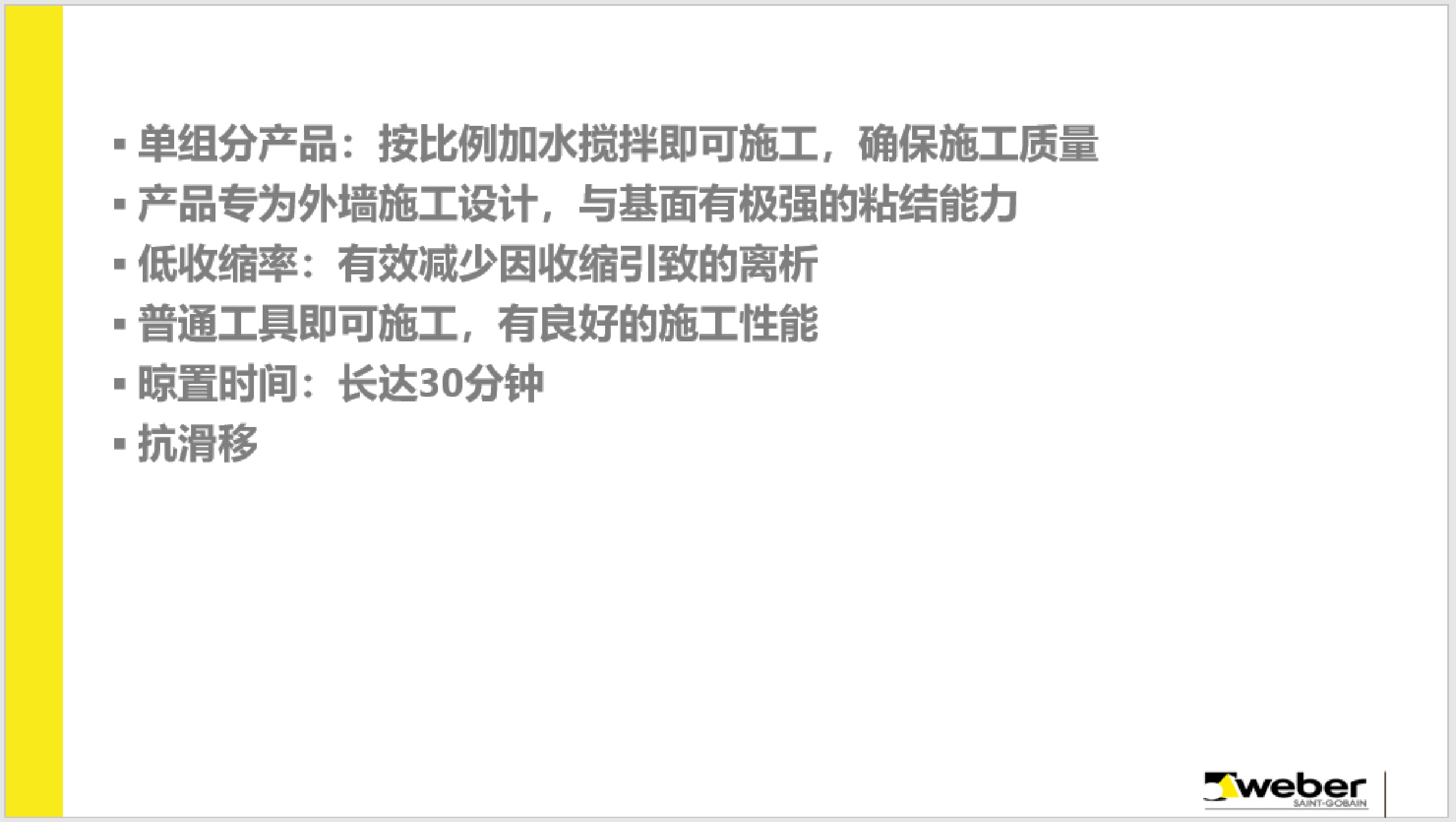偉伯強韌瓷磚粘結劑353 基本參數 偉伯強韌瓷磚粘結劑353是一種單組分耐水型瓷磚粘結劑,加水攪拌即可使用。產品具高粘結強度、抗滑移性好、晾置時間長等優(yōu)異的施工性能。適用于陶瓷磚、大理石、花崗巖、瓷質磚、人造石及同質磚的室內外墻、地磚的粘貼、可在混凝土、水泥抹灰面、石膏板、磚墻以及加氣混凝土(ALC) 墻板上粘貼。 功能 圣戈班高科技材料(上海)有限公司 上海市浦東新區(qū)王橋路968號 4008885838 [email protected] 聯系我們 聖戈班香港有限公司 香港灣仔莊士敦道181號大有大廈16樓1601-8室 (852) 2866 9199 [email protected] 聯系我們