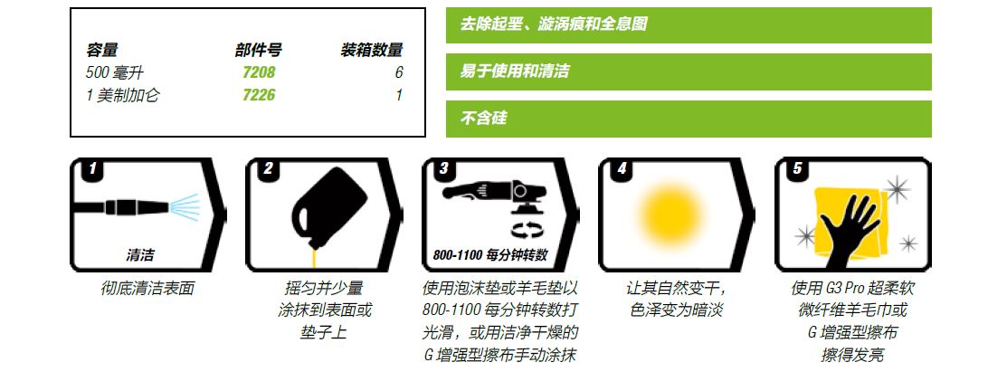G3 Pro研磨上光蠟配方升級,名稱改為全能拋光劑,它可修復許多不同表面和漆面狀況,包括油漆、亮漆、鉻、鋁、塑料鏡片和玻璃??梢允謩踊蚺c拋光機配合使用,消除中等和輕微的磨痕、旋紋、霧紋、氧化、水印等,在最終保護之前獲得高光澤漆面和疏水層。