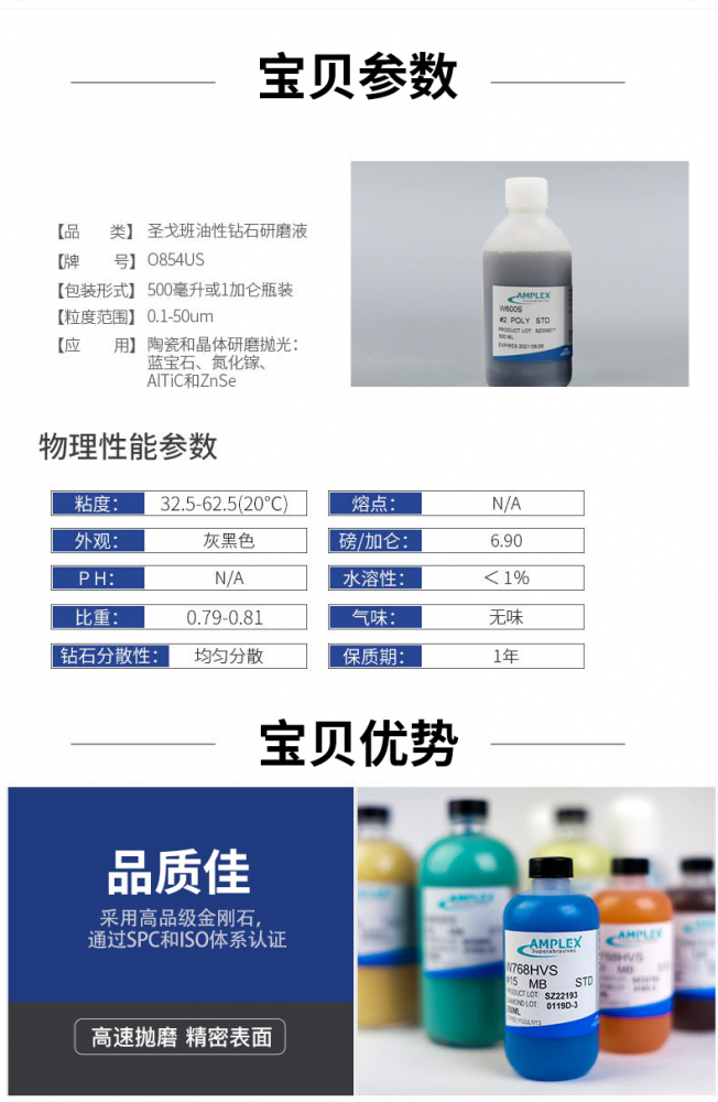 圣戈班精密拋磨專為研磨和拋光陶瓷和藍(lán)寶石設(shè)計(jì)的圣戈班油基拋光液采用精制精密級(jí)金剛石粉末制造而成。O854系列利用潤滑劑減少對(duì)工件的劃傷和損壞,在研磨過程中可獲得強(qiáng)力切削效果。圣戈班油基拋光液使用安全,符合EPA和OSHA要求。更多訪問:https://www.surfaceconditioning.saint-gobain.com/products/oil-based-slurries